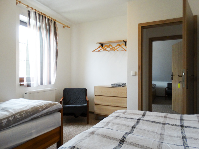 - Ostatní pokoje (celkem 12 lůžek) jsou v samostatné budově a mají sdílené dvě koupelny a tři záchody. Na fotce níže budova vlevo.